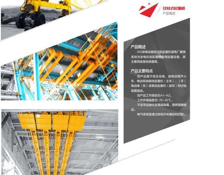1、   XG型電動懸掛過軌起重機是電廠磨煤系統(tǒng)為發(fā)電機組配套的專用起重設(shè)備,其主要用途是檢修磨煤。
