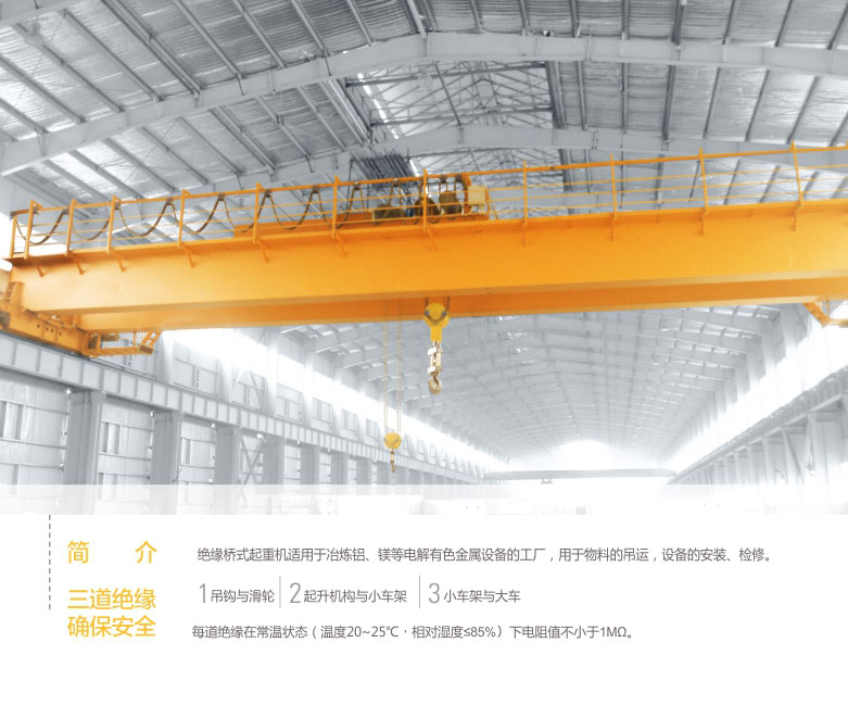 1、 QY型絕緣吊鉤橋式起重機(jī)適用于有色金屬電解鋁、鎂、鉛、鋅等冶煉車(chē)間。
